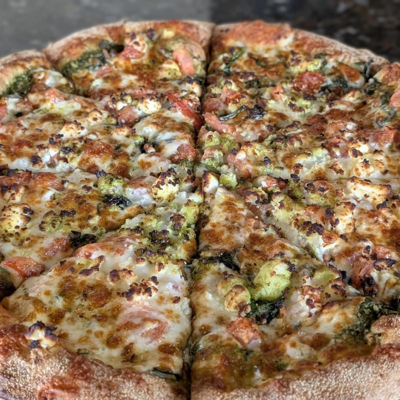 Toppings are charged individually by size. Pepperoni, hamburger, sausage, bacon, ham, jalapeno pepper, tomato, black olive, mushrooms, broccoli, garlic, pineapple, banana pepper, chicken, prosciutto, meatballs, feta cheese, spinach, pesto, roasted red pepper, eggplant, artichoke heart